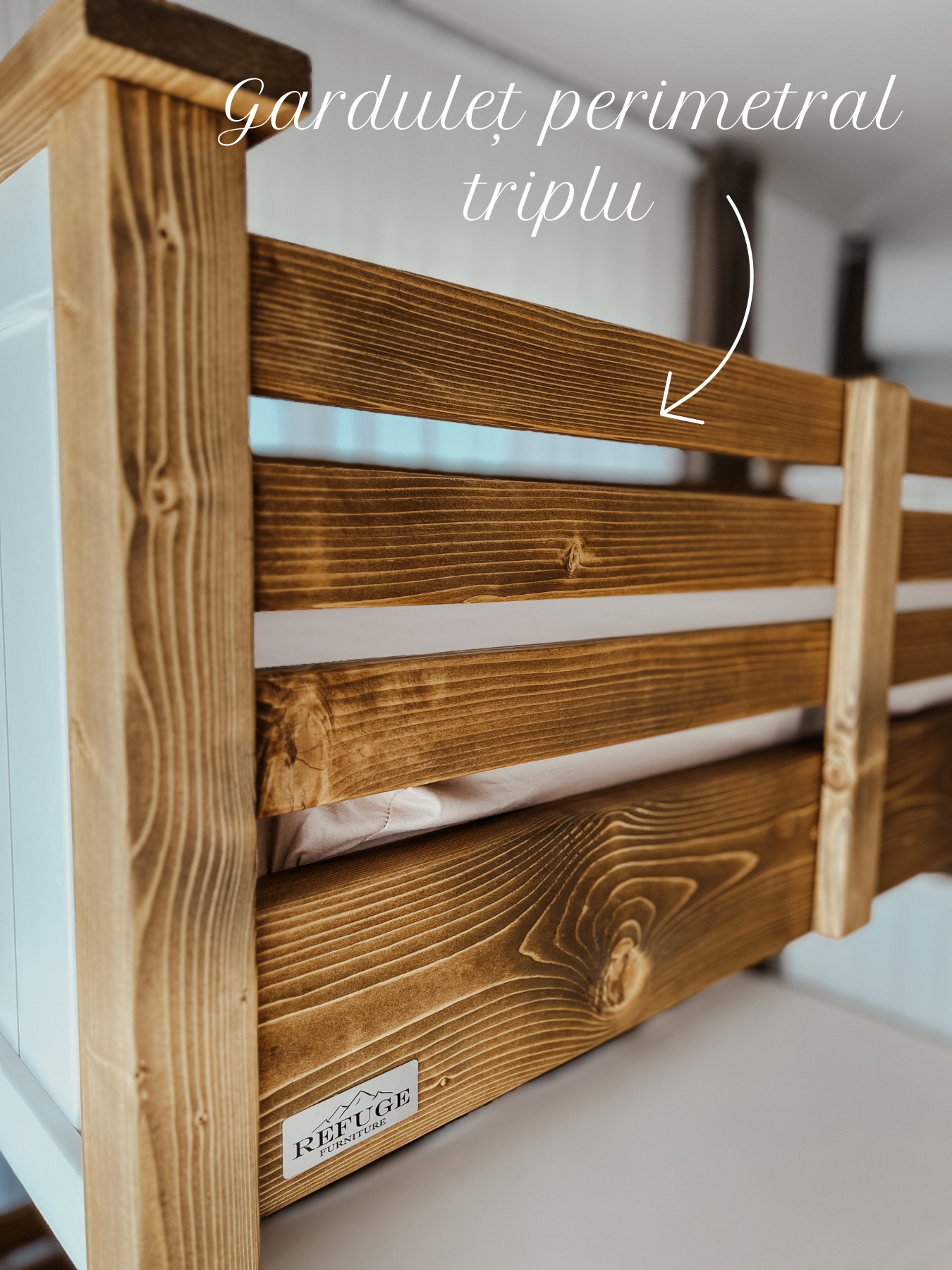 Paturile suprapuse Refuge salvează spațiul în camera copiilor, oferindu-le confortul unui somn odihnitor noaptea și mai mult loc pentru desfășurarea activităților din timpul zilei. Acestea au structura realizată din lemn masiv de molid.