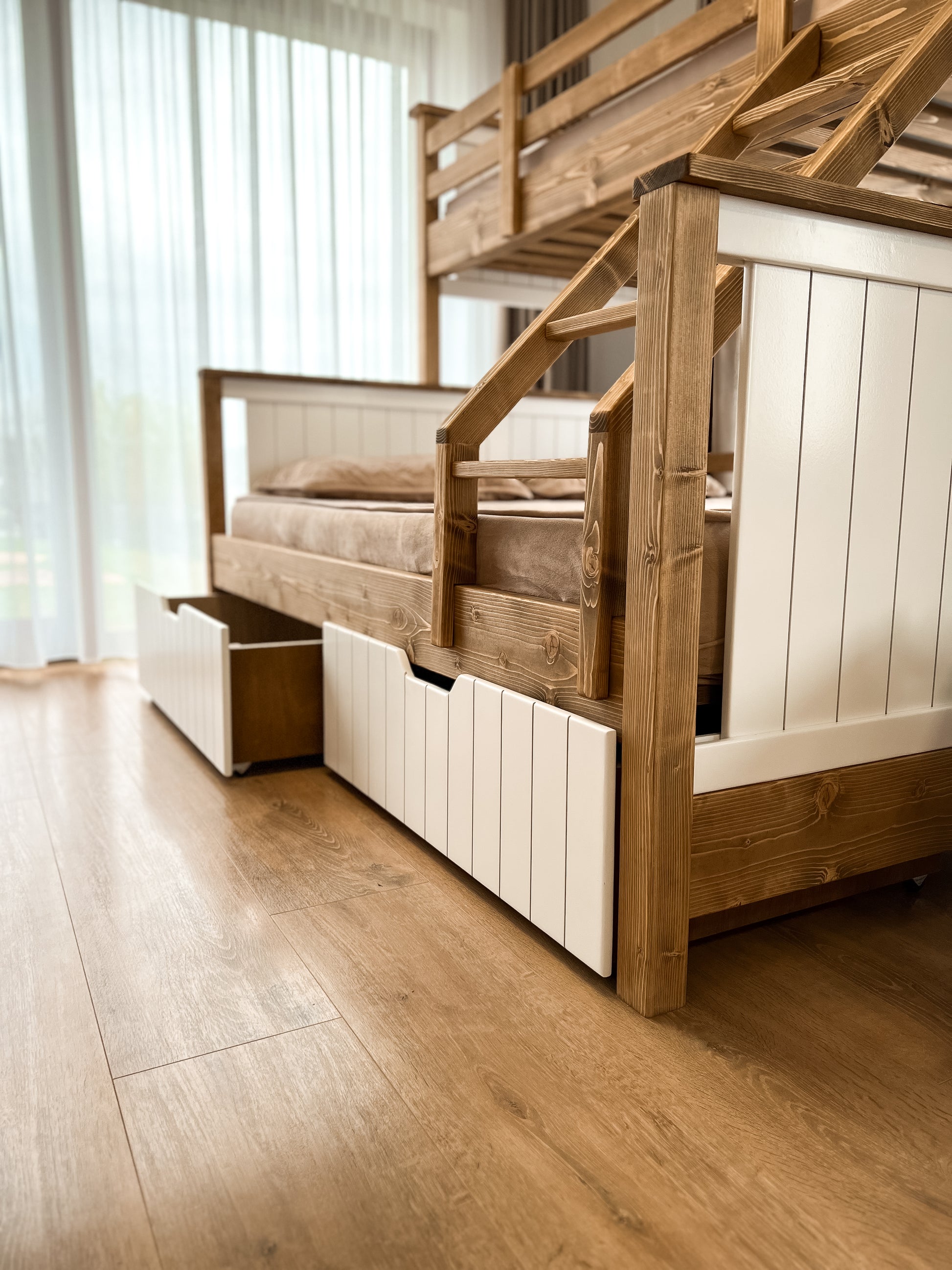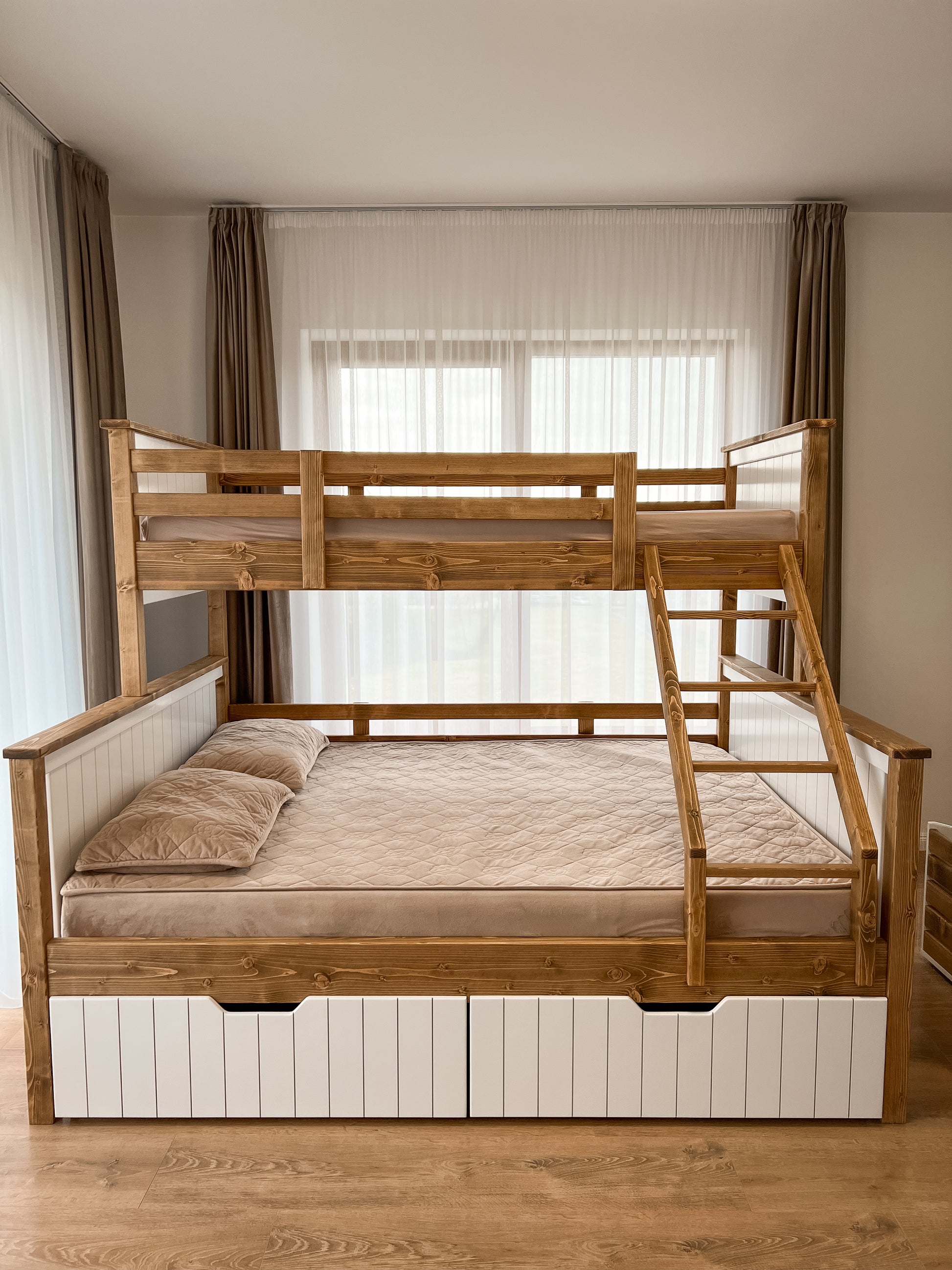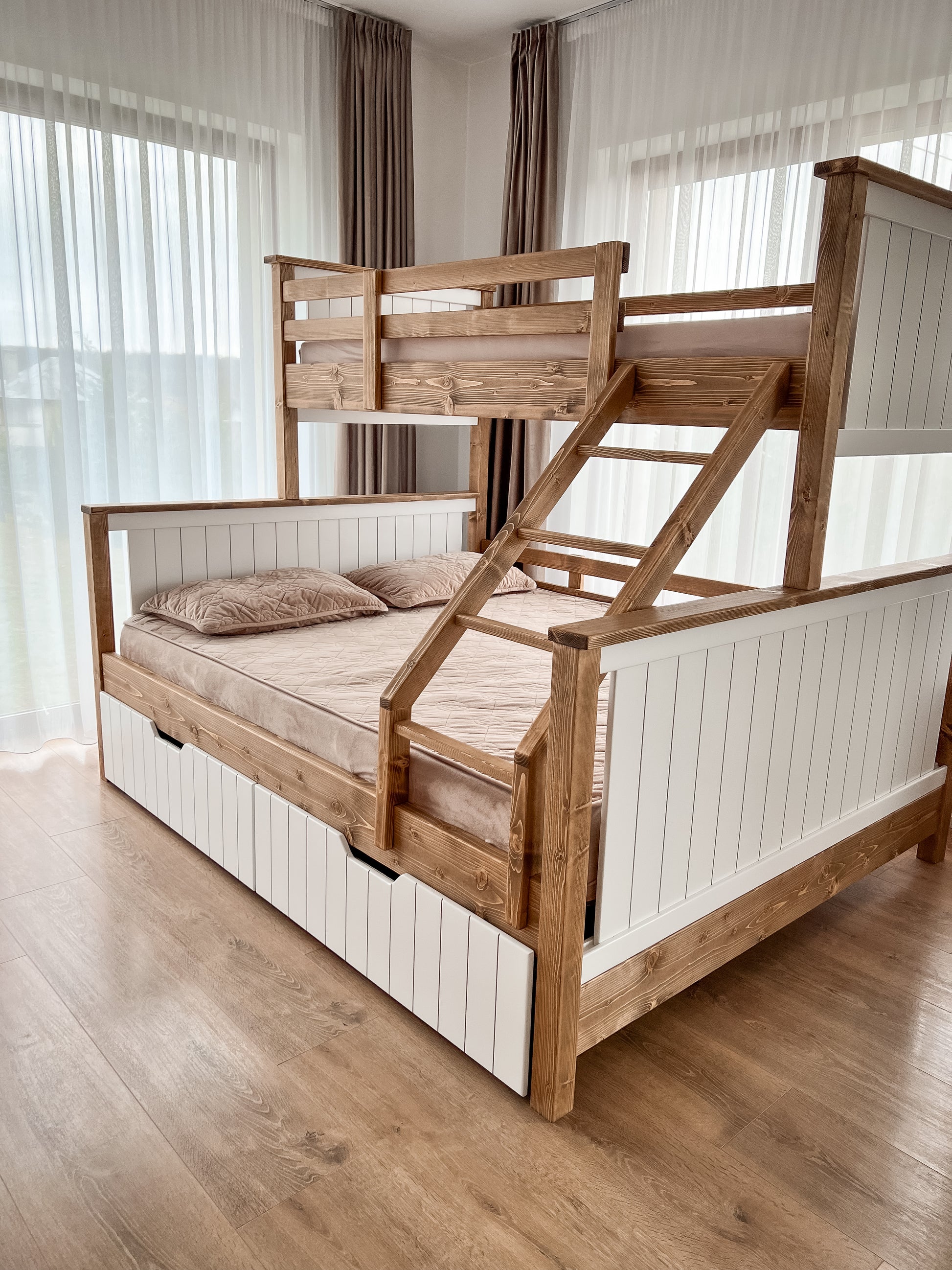 Patul supraetajat pentru 3 copii Refuge Wood Victoria cu sertare se poate realiza pentru o saltea cu dimensiunea 140x200 cm sau o saltea cu dimensiunea 160X200 cm și o saltea cu dimensiunea 90x200 cm.