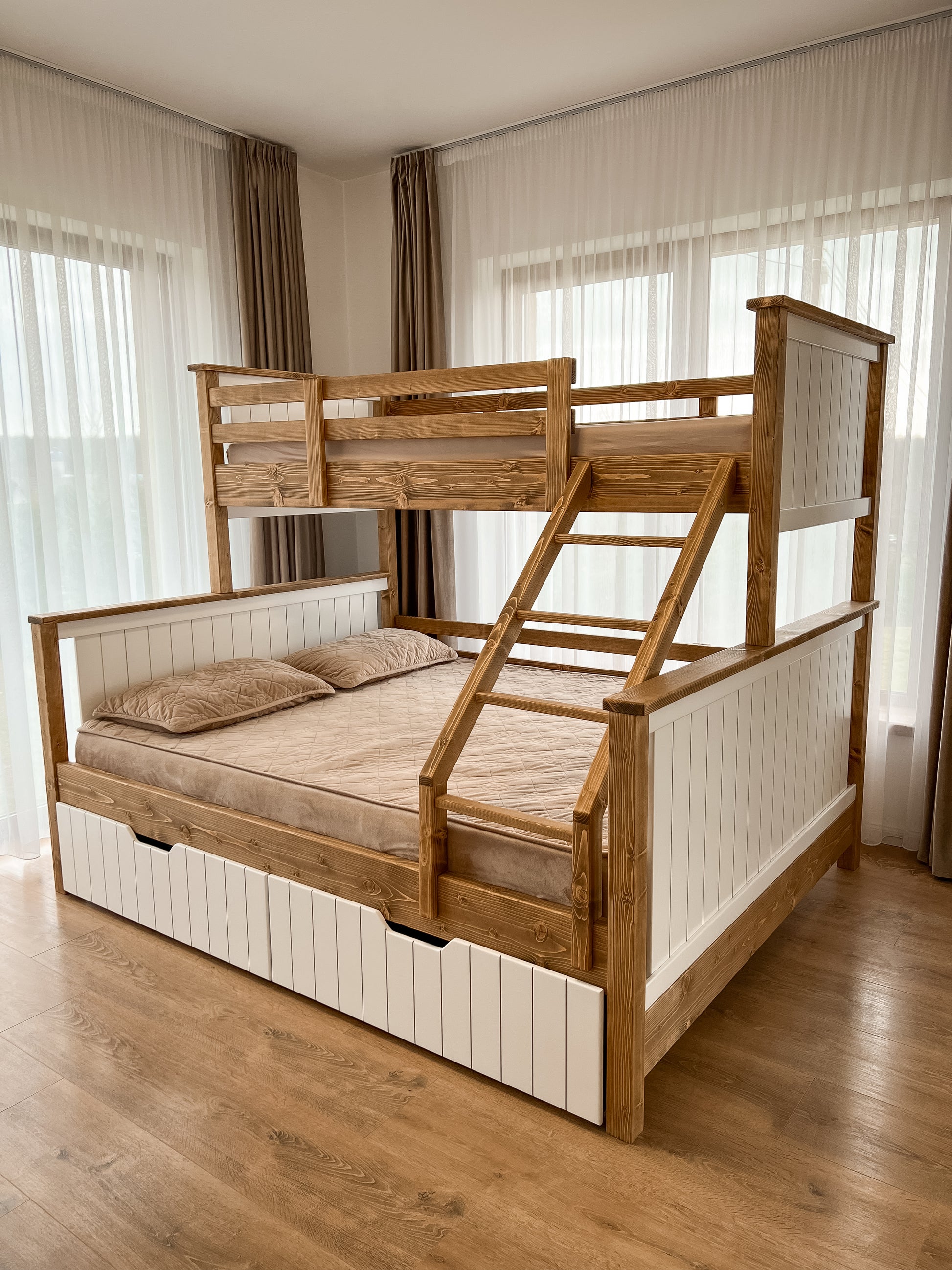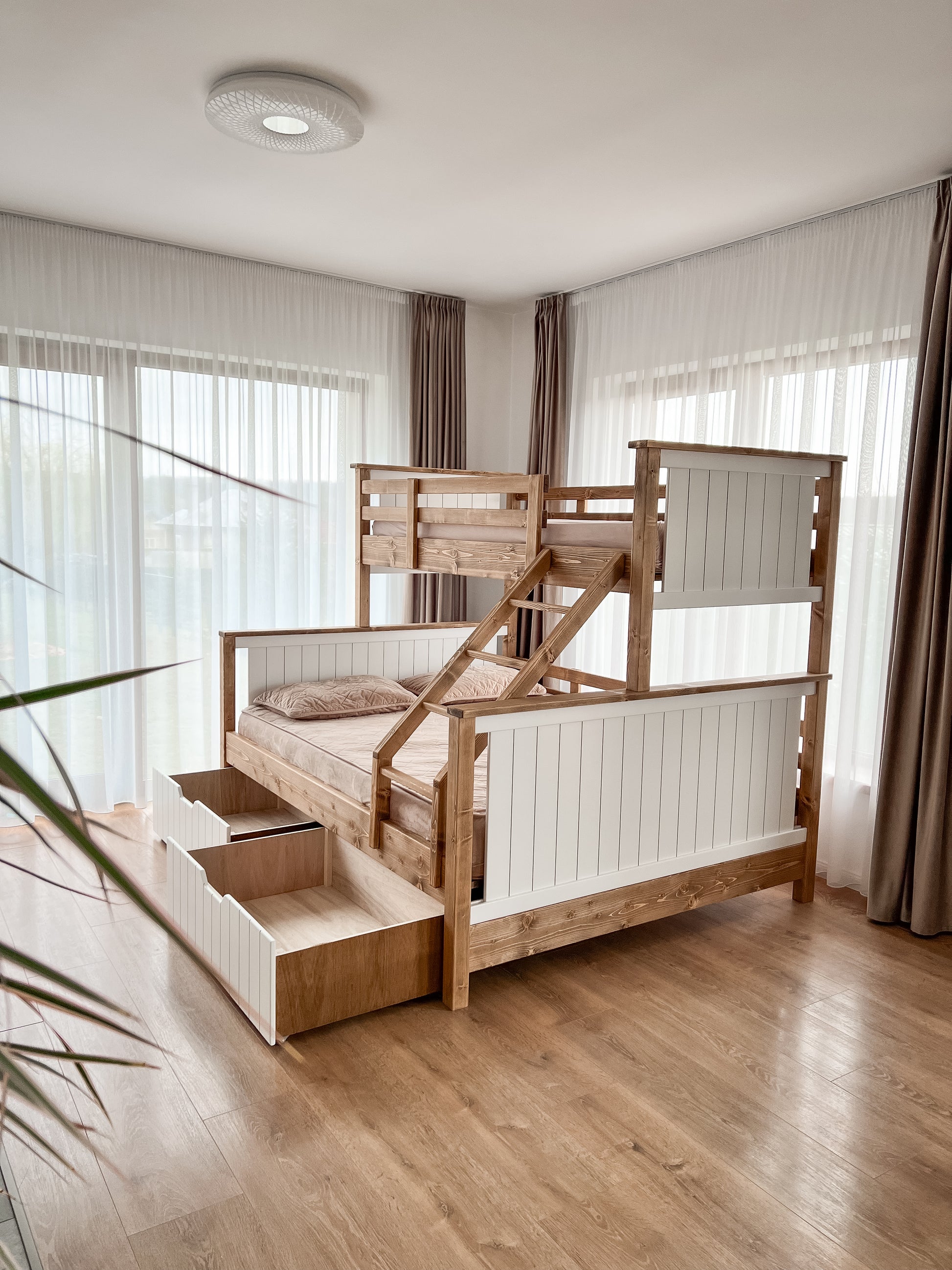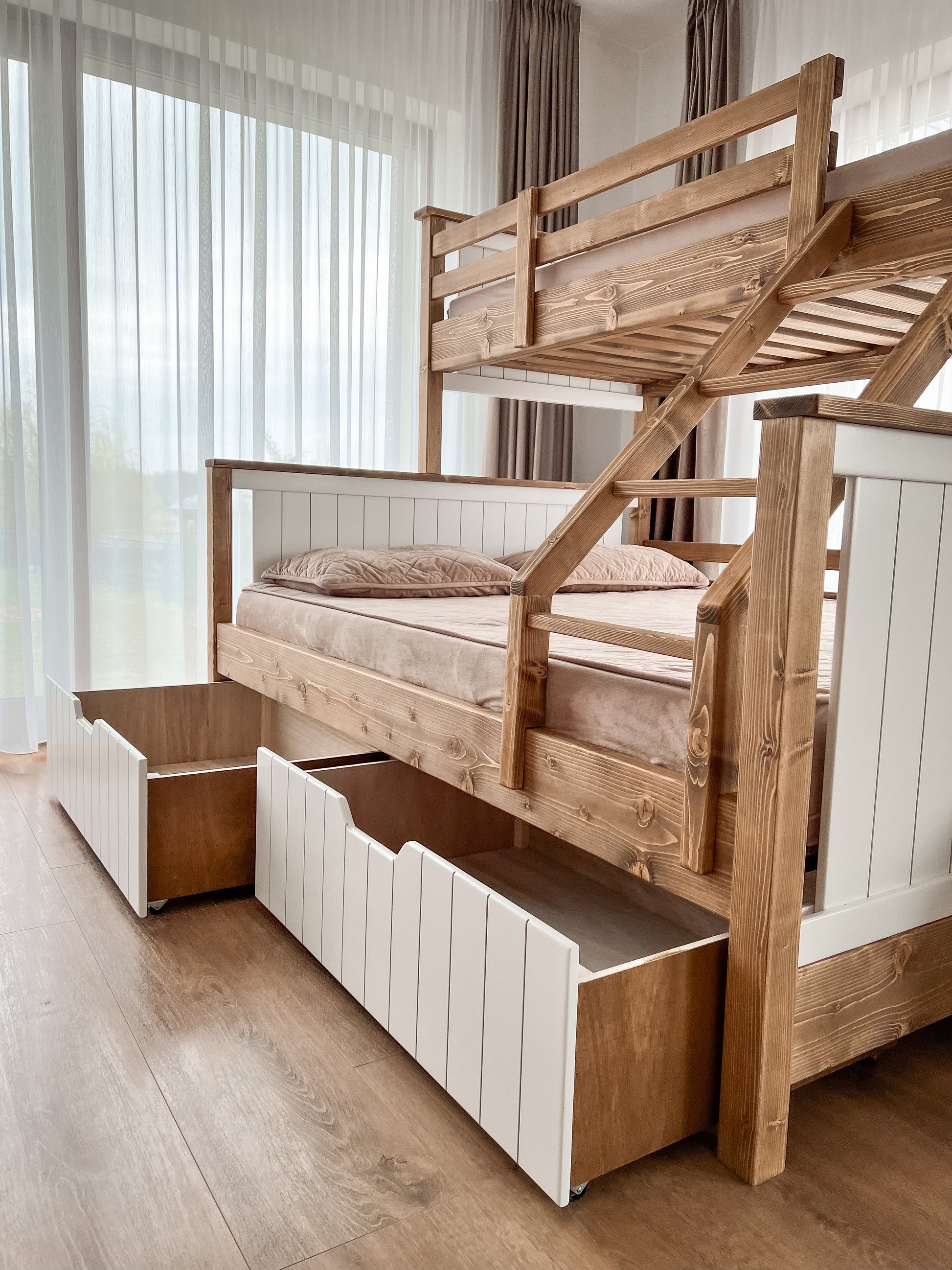 Patul supraetajat pentru 3 copii Refuge Wood Victoria cu sertare se poate realiza pentru o saltea cu dimensiunea 140x200 cm sau o saltea cu dimensiunea 160X200 cm și o saltea cu dimensiunea 90x200 cm.