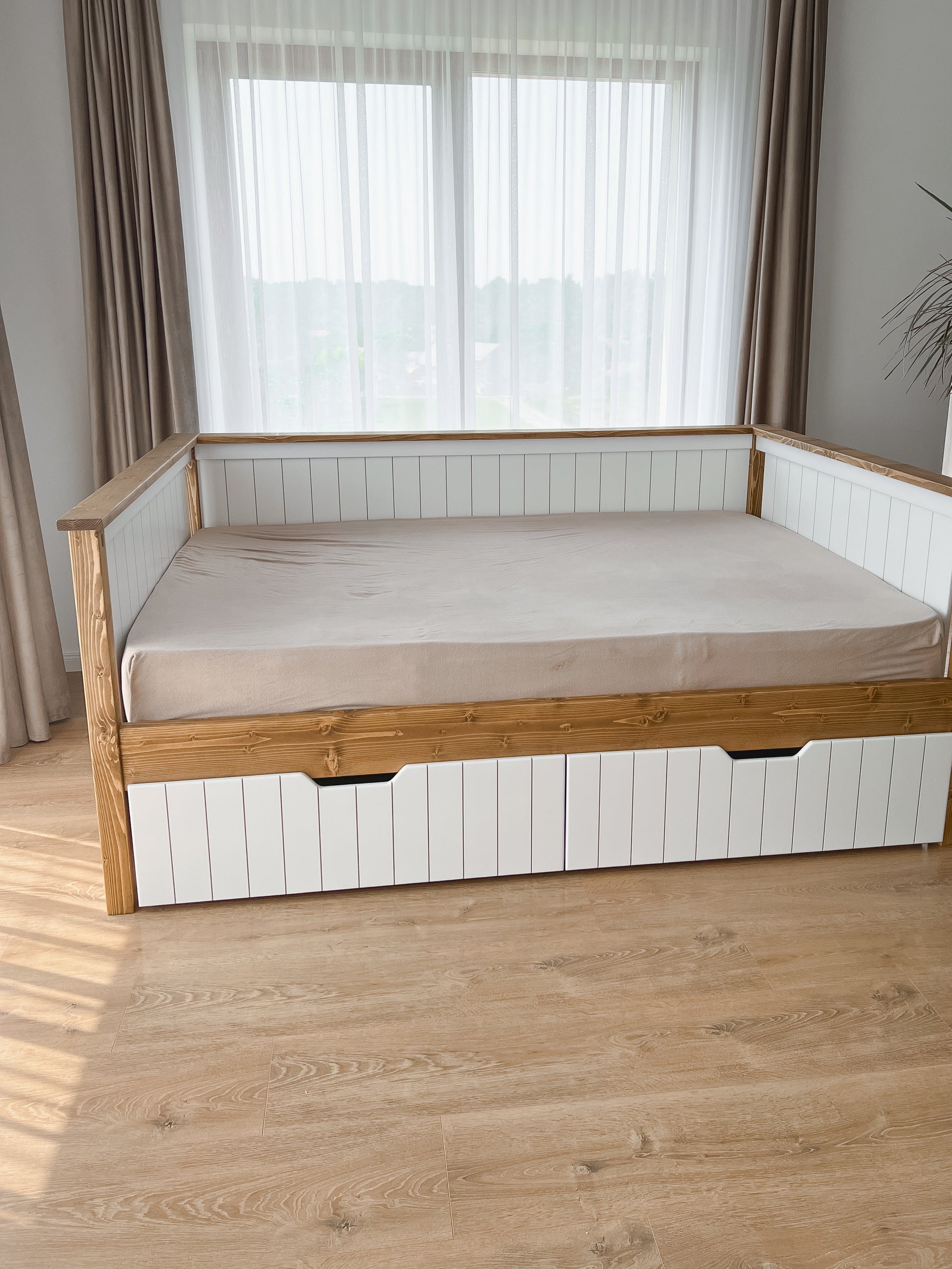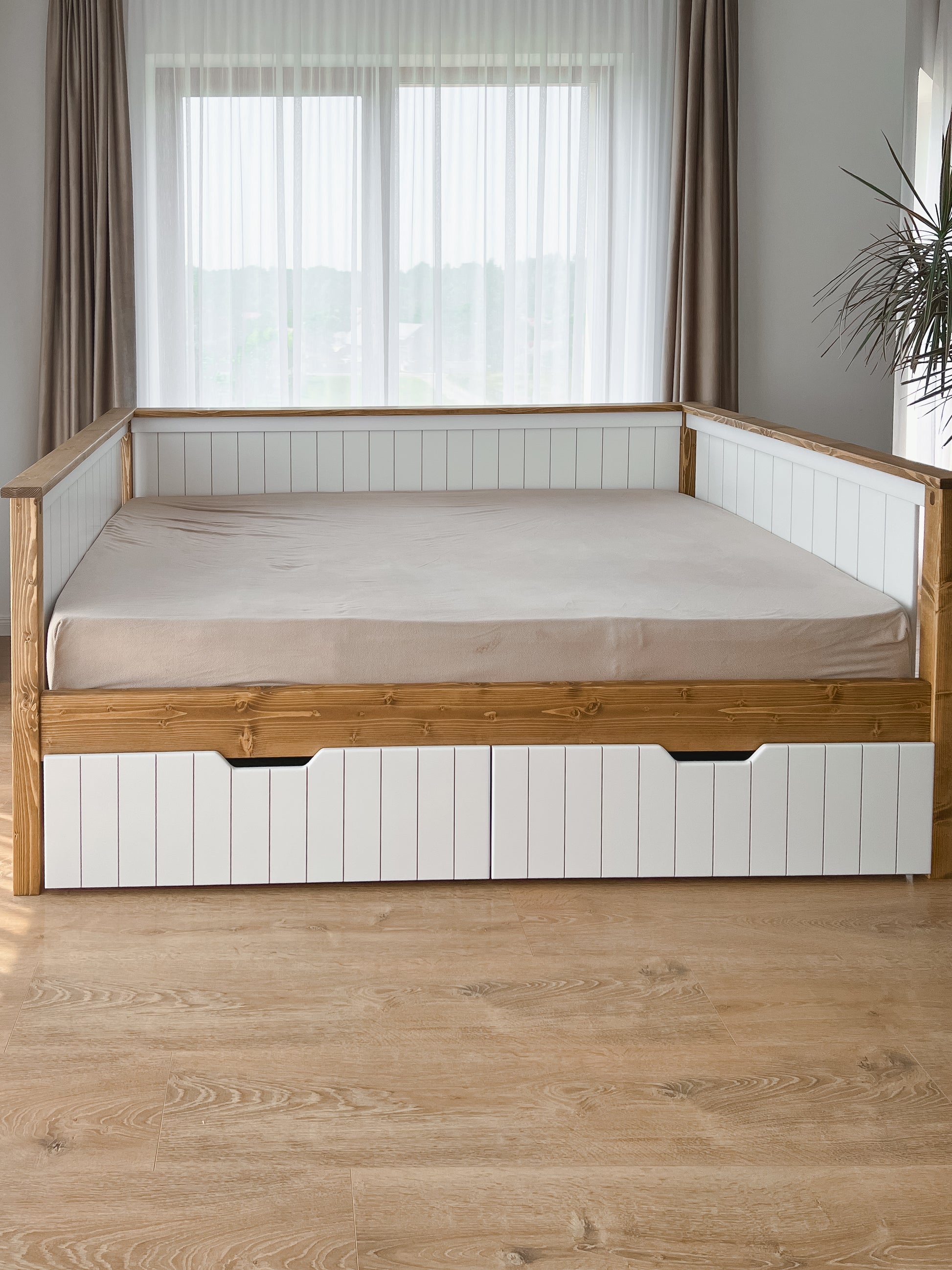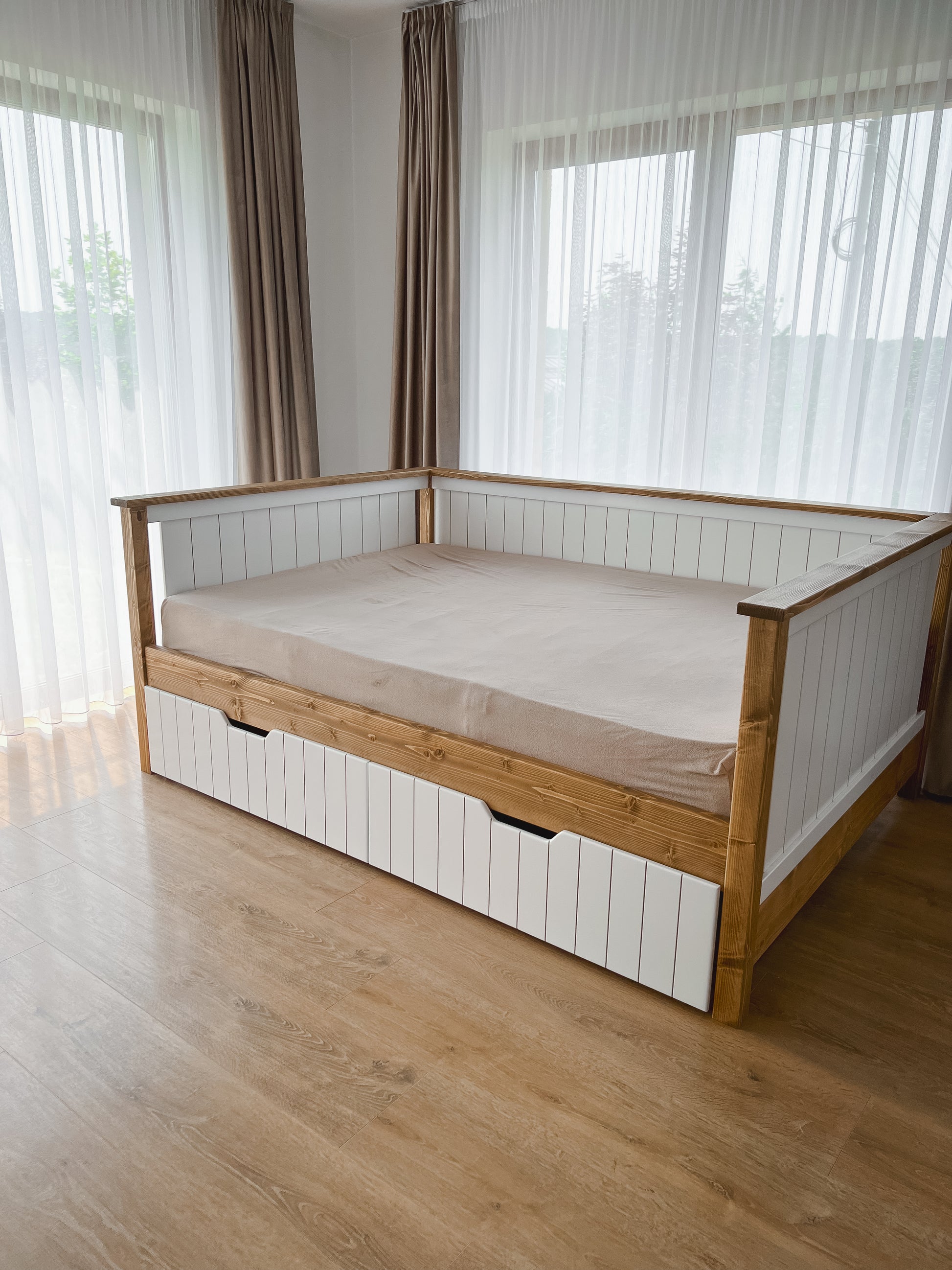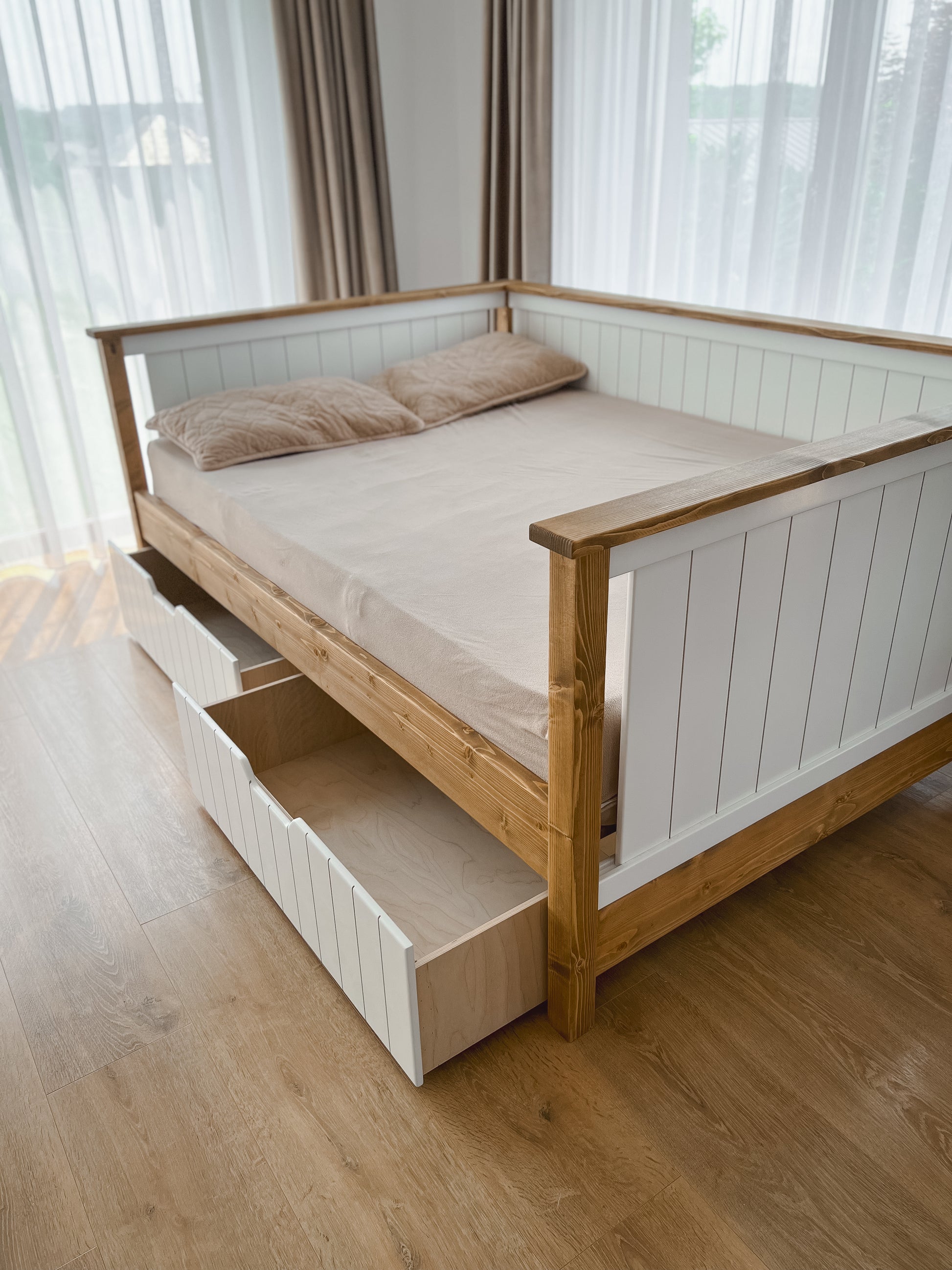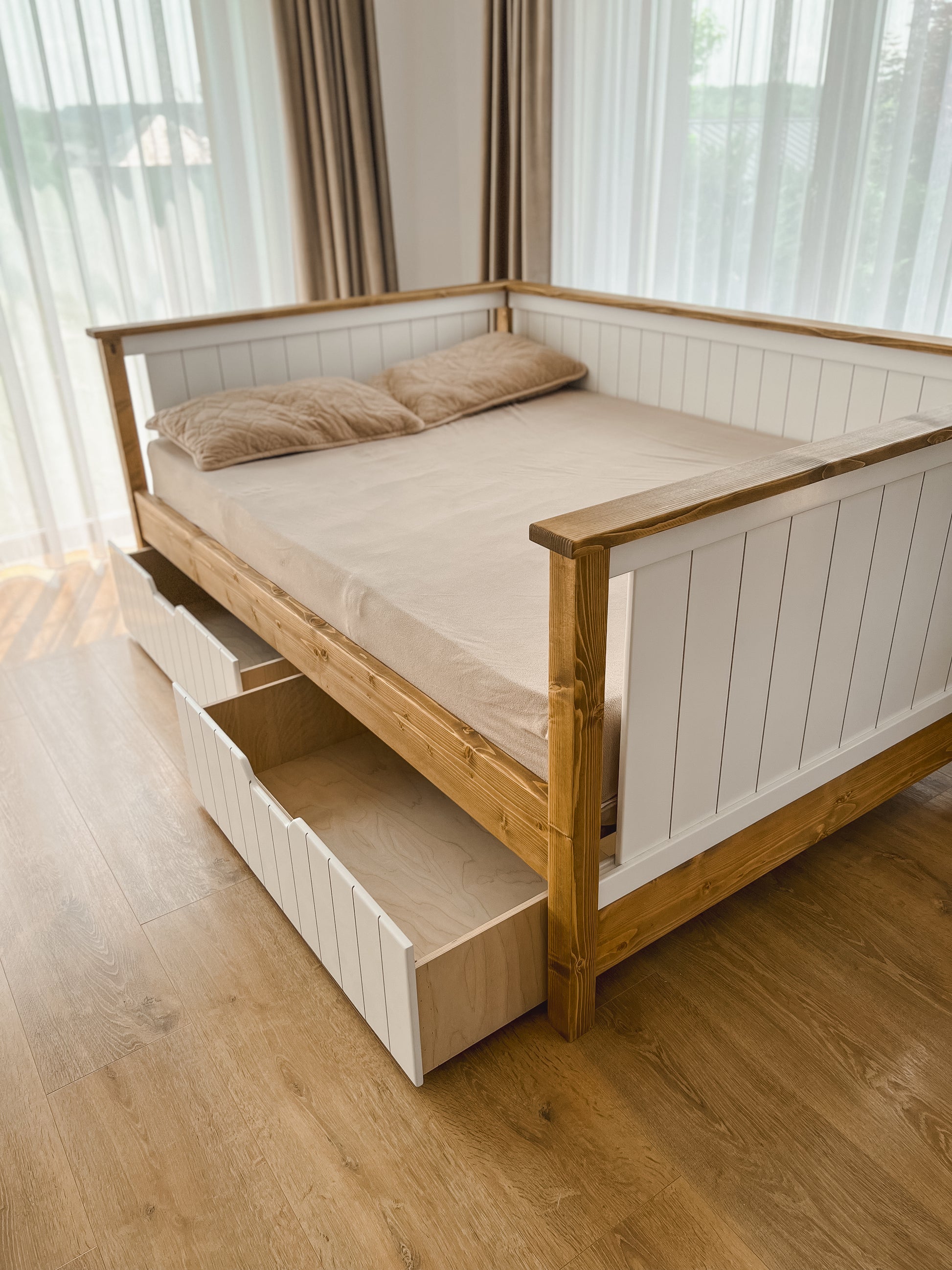 Patul este prevăzut cu 2 sertare, având o dimensiune utilă foarte generoasă. Fiecare sertar are 5 roți. Sarcină utilă sertar: 80 kg. Sertarele sunt prevăzute cu șină de ghidaj.