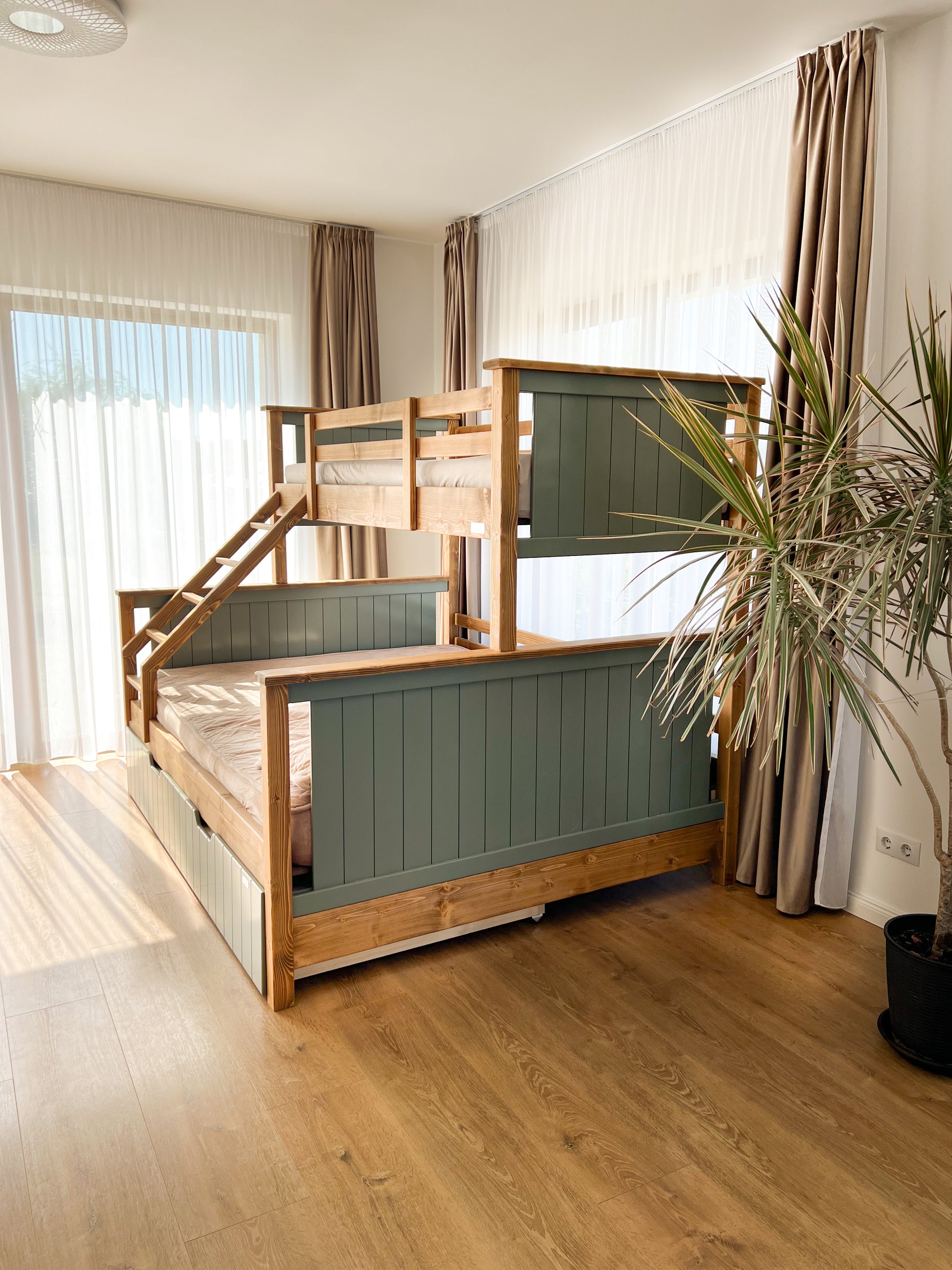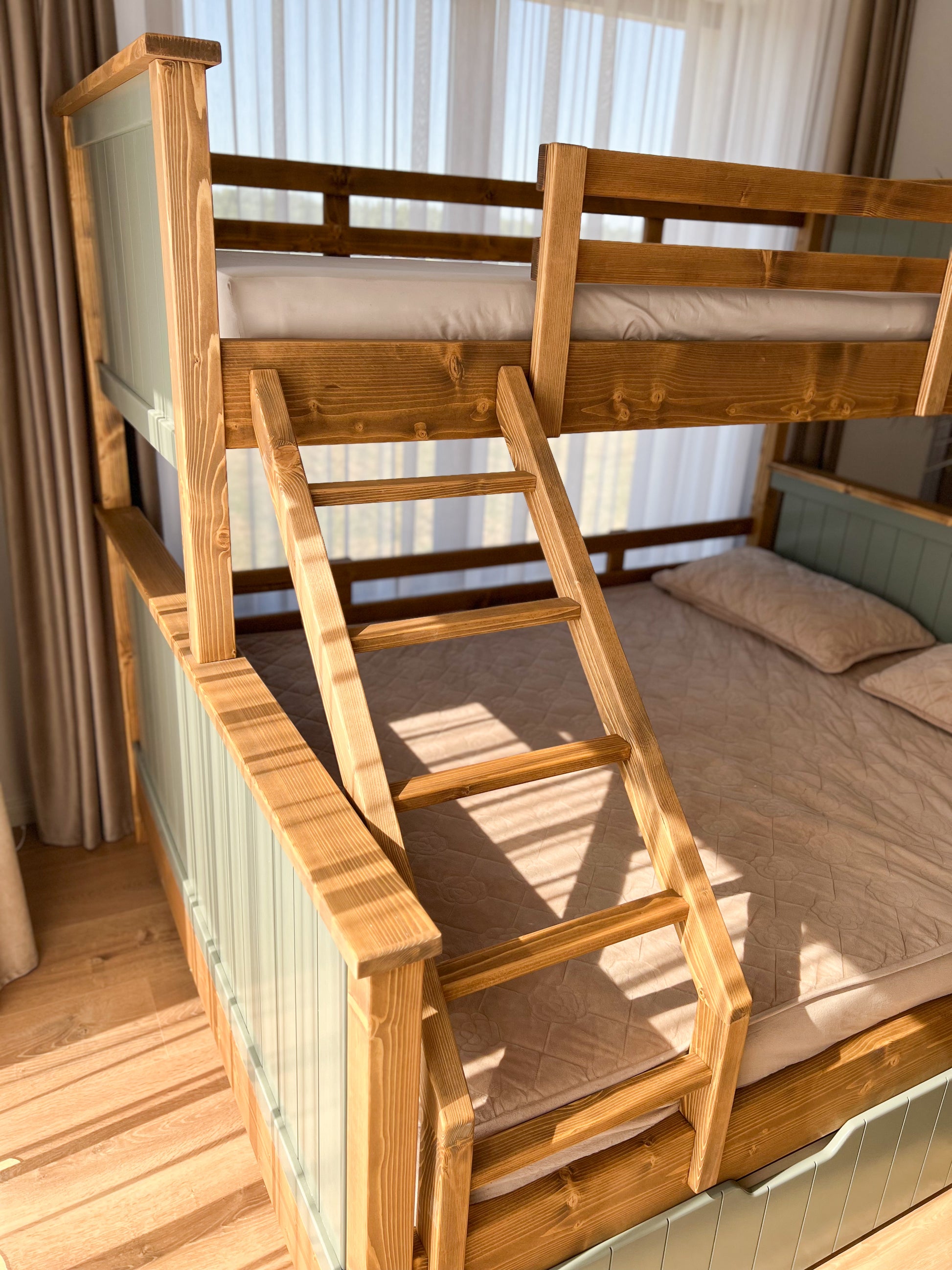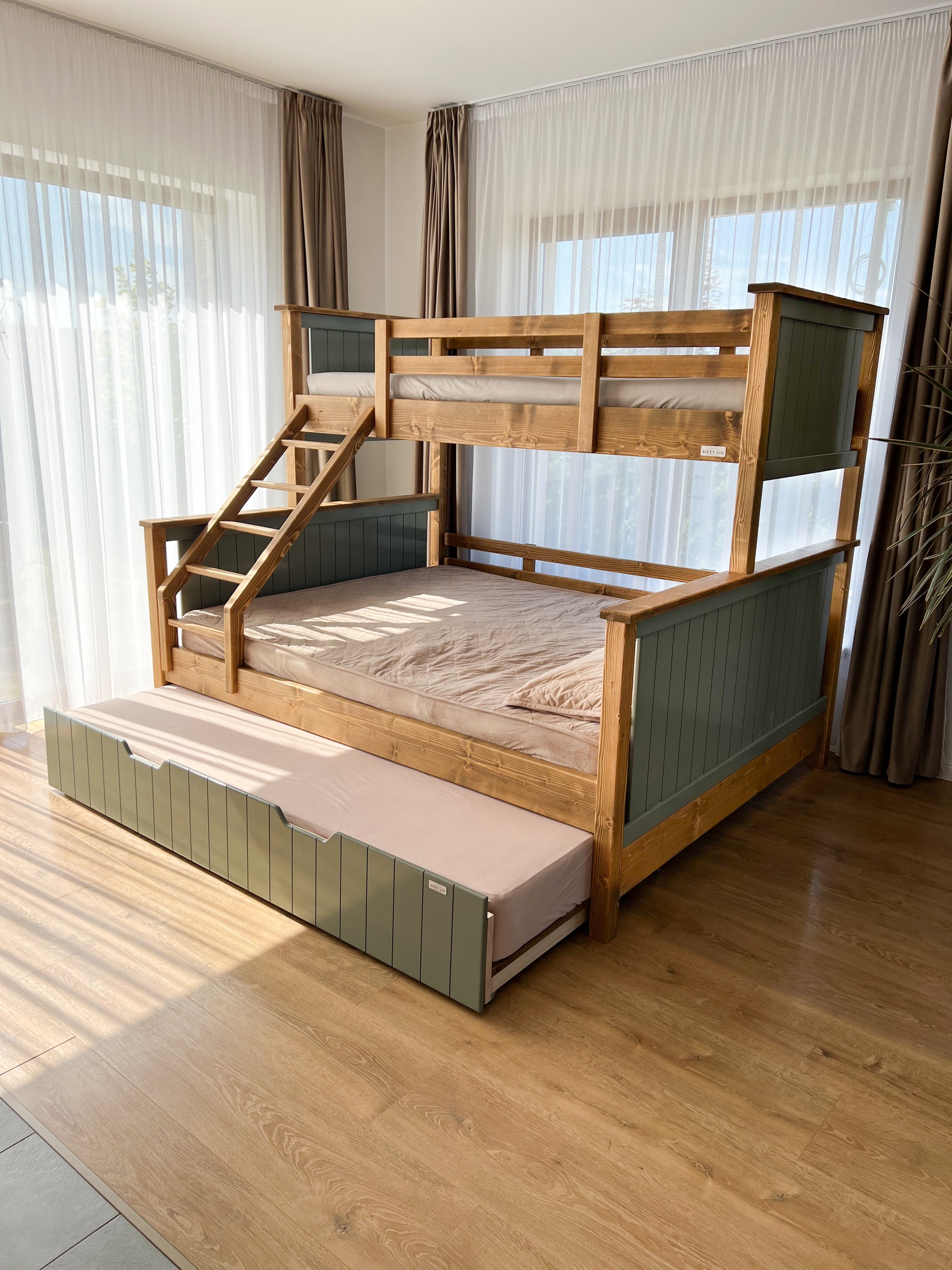 Patul supraetajat pentru 4 copii Refuge Wood Victoria Sage se poate realiza pentru o saltea cu dimensiunea 120x200 cm, 140x200 cm sau o saltea cu dimensiunea 160X200 cm și o saltea cu dimensiunea 90x200 cm.