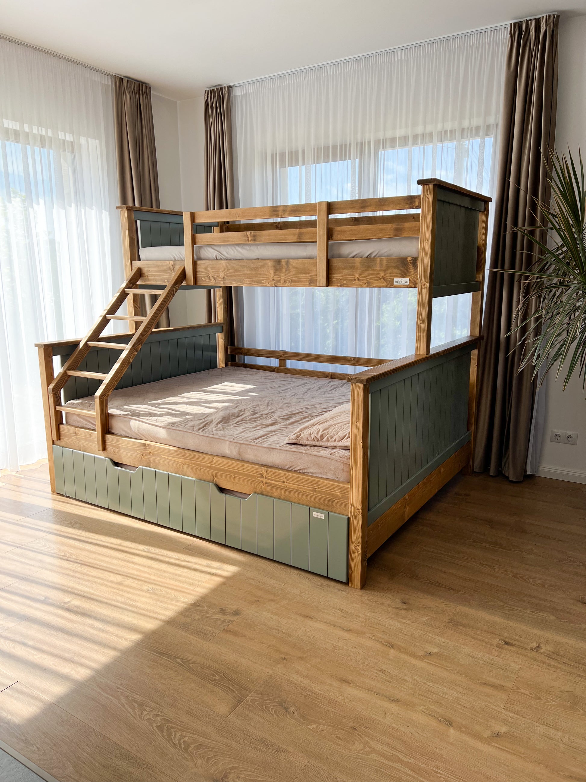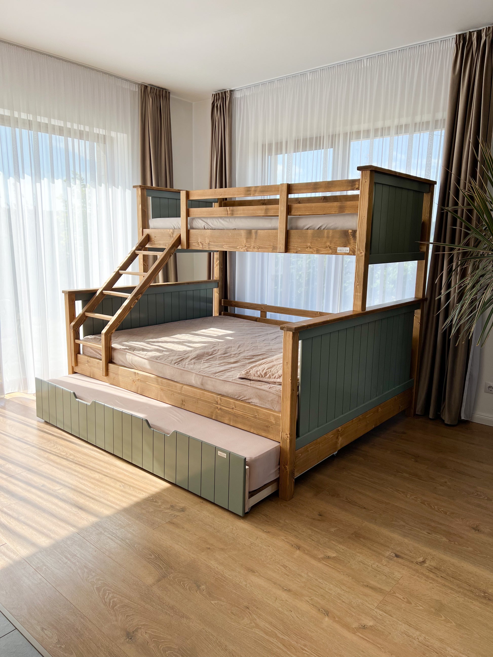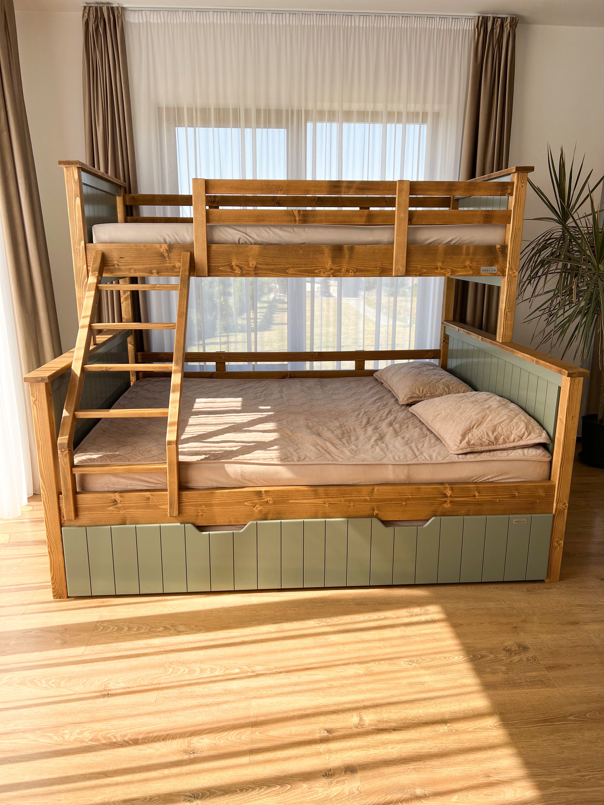 Paturile supraetajate Refuge salvează spațiul în camera copiilor, oferindu-le confortul unui somn odihnitor noaptea și mai mult loc pentru desfășurarea activităților din timpul zilei. Acestea au structura realizată din lemn masiv de molid.